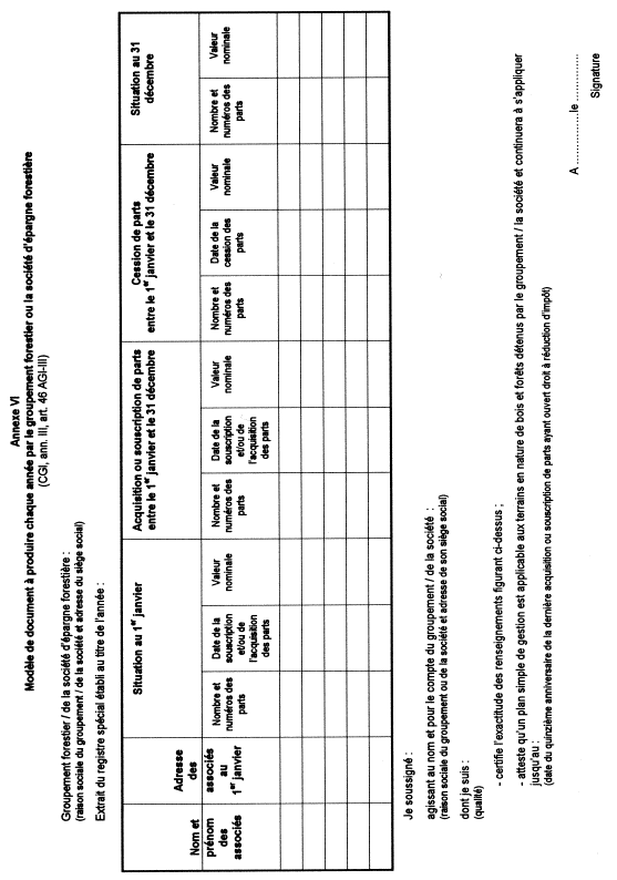 Annexe VI. Modèle de document à produire chaque année par le groupement forestier ou la société d’épargne forestière
