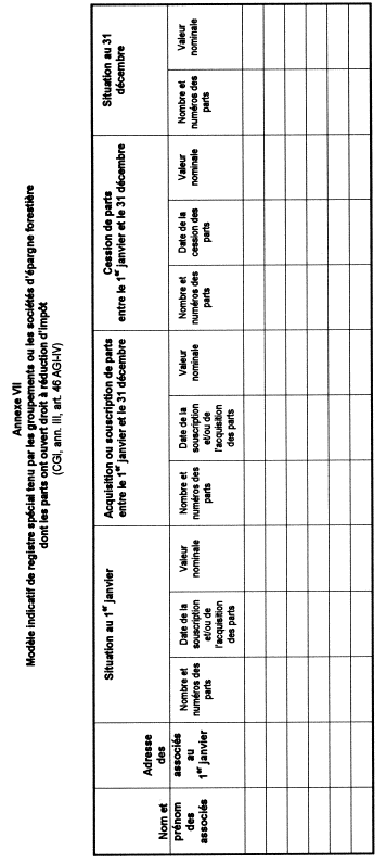 46. Les parts détenues par les associés qui entendent bénéficier de la réduction d’impôt sont inscrites, dans les trente jours suivant la date limite de dépôt de leurs déclarations de revenus mentionnée au n° 48., sur un compte ouvert au nom de l’associé dans la comptabilité du groupement ou de la société ou sur un registre spécial (voir l’annexe VII pour un modèle indicatif). Le groupement ou la société tient ce compte ou ce registre et conserve les documents relatifs aux opérations qui l’affectent jusqu’à la fin de la troisième année suivant celle de l'expiration de l'engagement de conservation des parts.
