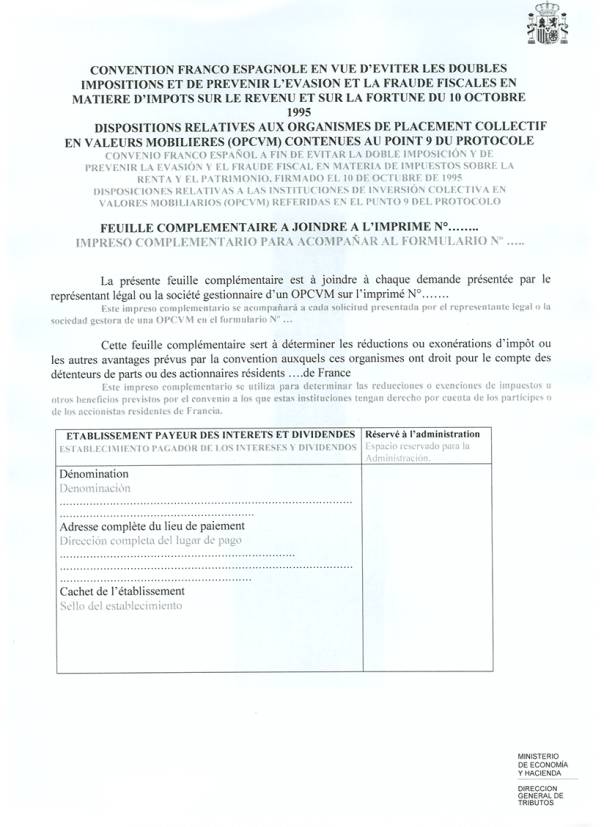 Chaque OPCVM constitué en France et qui perçoit des dividendes ou intérêts ayant leur source en Espagne pourra demander les réductions, exonérations d’impôt ou autres avantages prévus par la convention du 10 octobre 1995 pour la fraction de ces revenus correspondant aux droits détenus dans ledit OPCVM par les actionnaires ou porteurs de parts qui sont des résidents français.